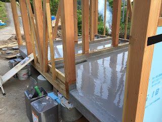 大工さんと左官さんが来られて、個室の入り口部分にドアを取り付けるためのの柱を取り付け、個室の壁が付く床にFRPを立ち上げるための高さ10cmの角材を取り付ける。左官さんが床と壁の接合部を滑らかにするために断面が三角形の面木を適当な長さに切って取り付け、隙間を充填剤で埋めていく。床面の下準備が終わったら、樹脂製の細い糸が絡まった和紙のようなマットをちぎって2枚重ねて壁の立ち上がりや床に張り、その上からFRPの樹脂を流してコロで引き延ばしていく。ずっとしゃがんでの作業で大変だ。樹脂の色が緑がかった色になったら固まった合図。余分なところをカッターで切り落としていくが、相当固くなっていて苦労されていた。中塗りの灰色の塗料をぬって本日の作業は終了。明日さらに別の塗料を塗ったら完成だそうだ。